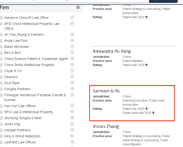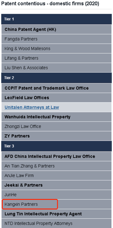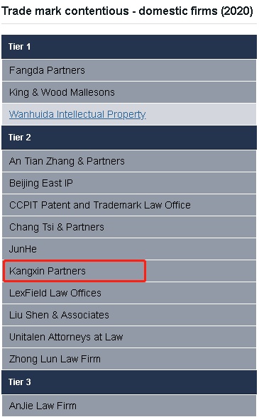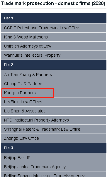 康信在中国区商标申请及维权两个榜单中均位列优秀知识产权事务所行列(Tier 2);在中国区专利申请榜单中位列优秀知识产权事务所行列(Tier 2),在中国区专利维权榜单中位列优秀知识产权事务所行列(Tier 3)。