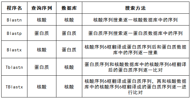 核酸和氨基酸等物质是医药&化学领域中特有的物质类型,生物序列是该种物质的唯一标识,是进行该种物质检索时的重要检索入口。数据库NCBI提供了生物序列检索功能,其包括BlastTp、BlastTn、BlastTx等多个程序,其程序的适用类型及检索方法见下图所示。
