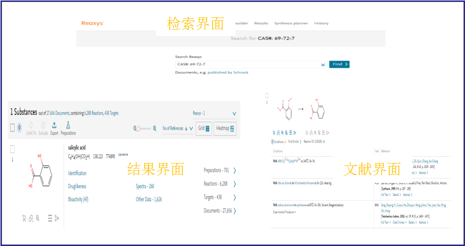 以Reaxys数据库为例,在检索界面中输入水杨酸CAS登记号69-72-7,可获得涉及水杨酸的制备、反应等多种技术角度的文献信息。