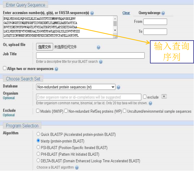 下图为Blast的检索界面,以一种抗体(具体序列如下图中所示)为例,由于检索的序列为蛋白质序列,因而选择Blastp程序进行检索。