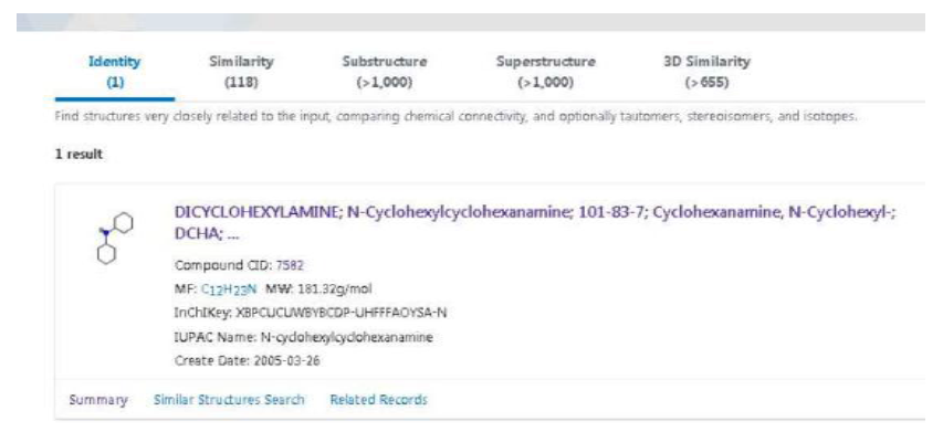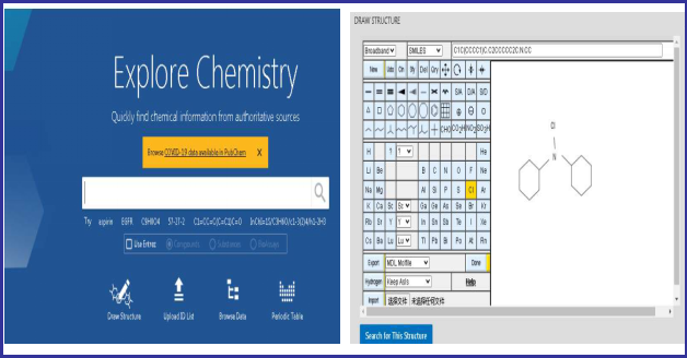 下图为Pubchem的检索界面,点击Draw Structure进入结构式编辑界面,绘制二环己胺化学结构式并进行检索。