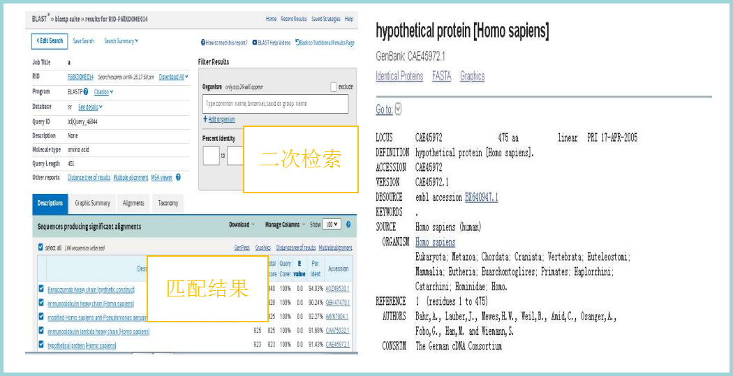 下图为检索结果界面,其中展示了检索结果并且列出了检索结果与目标序列的匹配情况,在该界面中还可对结果进行二次筛选。点击结果中的匹配序列,可以进一步查询包含该序列的文献。