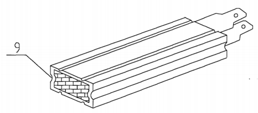 “2. 一种PTC发热器,包含发热芯(10)和散热铝条(11),其特征在于:所述发热芯(10)由陶瓷PTC发热元件(5)、绝缘陶瓷片(6)、导电电极(7)和绝缘层(8)穿过导热铝管(1)的空腔后压制形成;所述散热铝条(11)粘贴在发热芯(10)中导热铝管(1)的上下表面上;所述导热铝管(1)压制后在左侧面和右侧面上分别形成半圆形的凹槽(9)。”