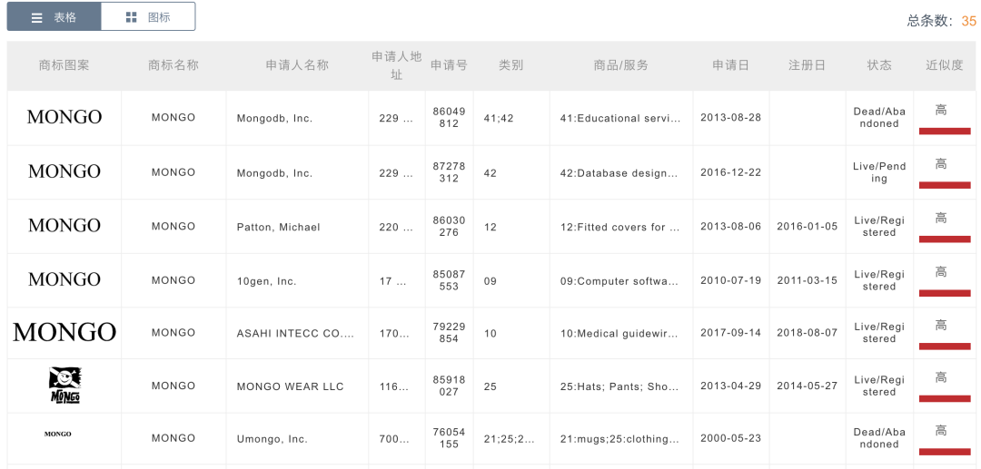 “表格”模式能够展现商标的申请人名称、申请号、申请状态等详细信息。