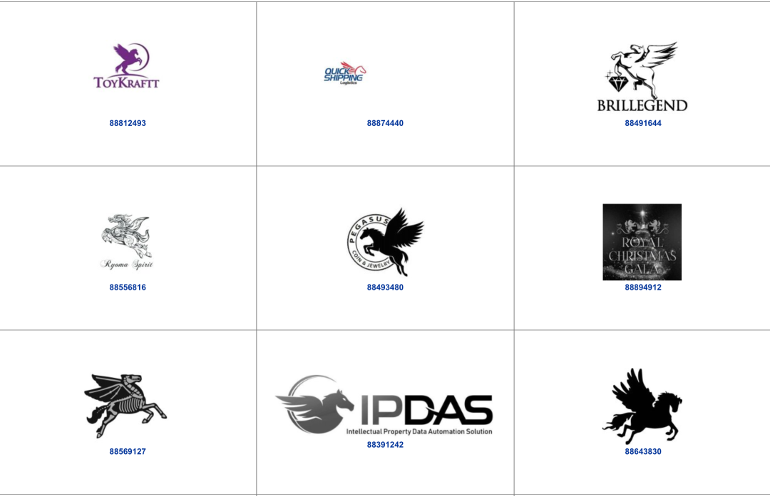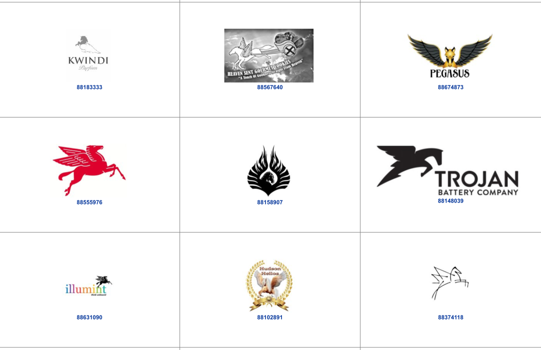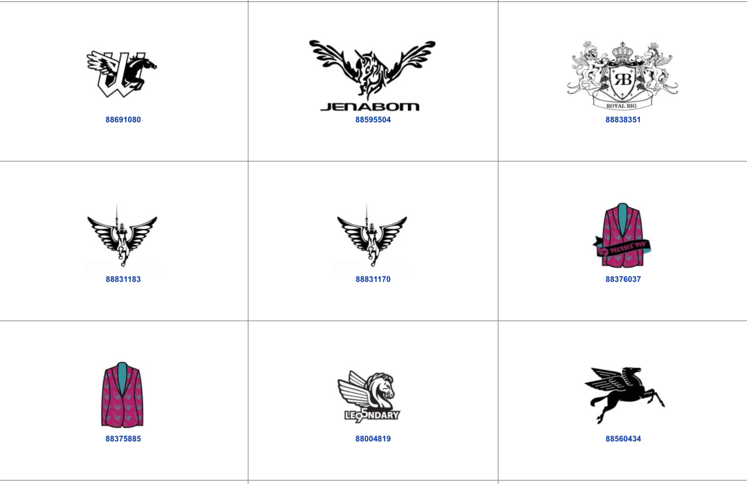 首先需要在美国商标图形编码中找到该图形对应的编码为:04.05.03(翼马,包括飞马),通过编码检索,结果共展现出881条,我们在搜索结果的第5页找到了该商标: