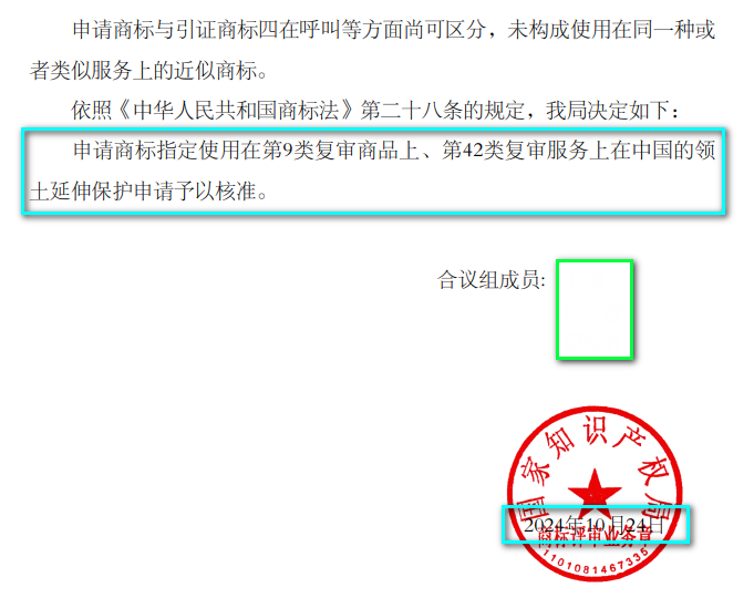 以第G1709767号国际商标为例,其基于原属国意大利进行国际注册,原属局同属于协定和议定缔约方,故,该商标为根据马德里协定和马德里议定(834 Madrid Protocol by virtue of Article 9sexies)进行的商标国际注册。商标注册部门收到的申请文件的“通知日期”(581 Date of notification)为2023年2月2日,该商标驳回期限届满之日为2023年2月2日+12个月=2024年2月2日。但是,在此期间,该商标遭遇全部驳回,商标注册人向国家知识产权局仅针对第9类和42类提交了驳回复审申请,国家知识产权局于2024年10月24日作出驳回复审决定,核准该商标在第9类和42类复审商品和服务项目在中国的领土延伸申请。可见,该商标在驳回期限届满时仍处在驳回复审程序中,即驳回复审作出之日早已过了驳回期限。